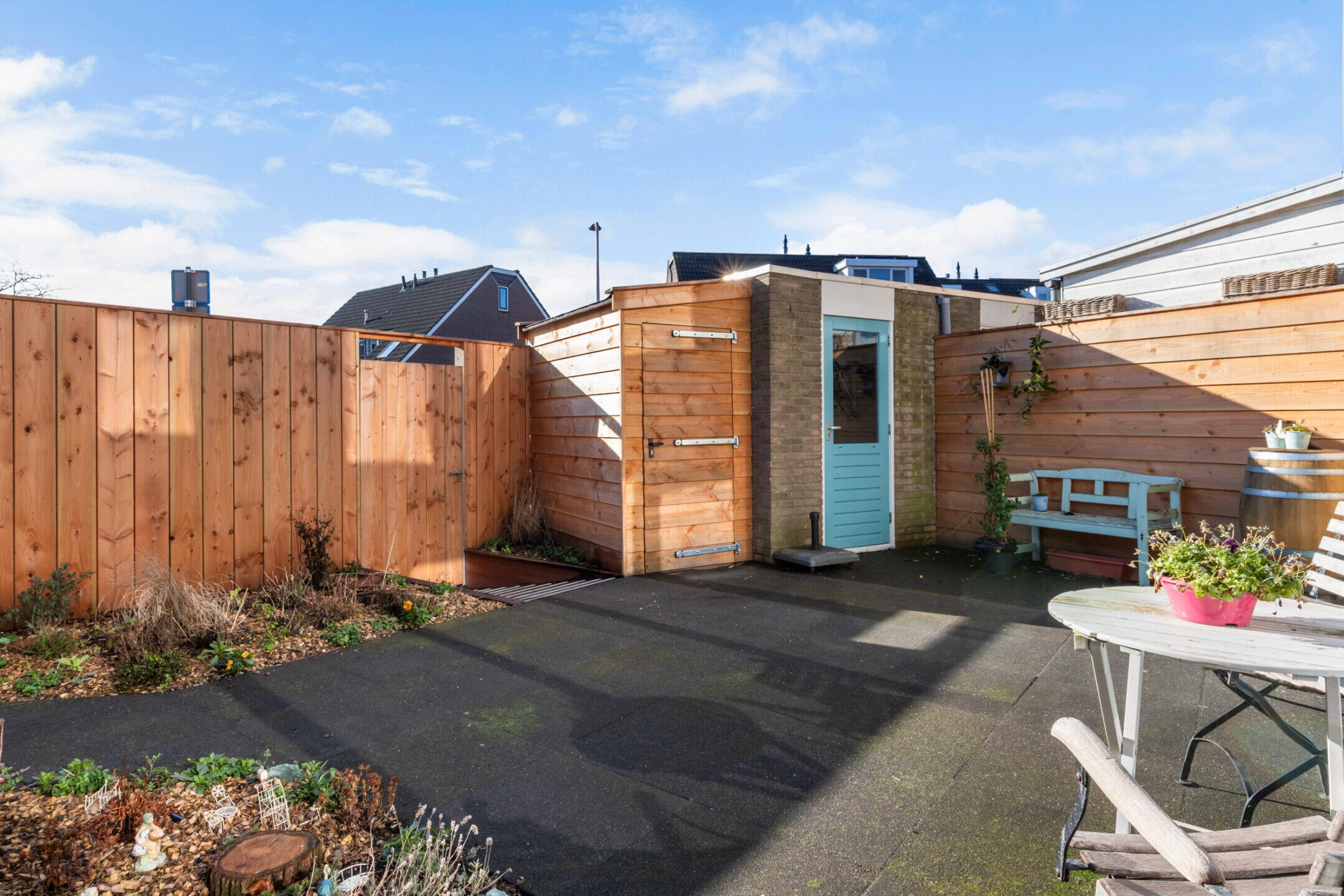 De achtertuin is ca. 43m2 groot en is gelegen op het zonnige zuiden. De tuin is recentelijk compleet en vakkundig gerenoveerd. Er is voor praktisch gemak een 2e schuurtje bijgekomen voor het stallen van de fietsen. De tuin is verder afgewerkt met douglas houten schuttingen en hardhout.